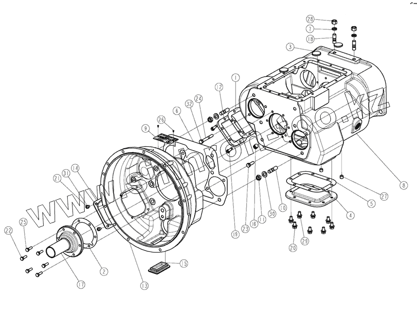 Каталог запасных частей к технике: Shaanxi 9JS135A-G1800. Картер сцепления и коробки передач