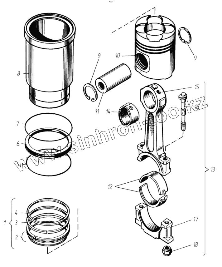 Каталог запасных частей к технике: ТМЗ-8481.10. Гильза цилиндра, поршень и шатун