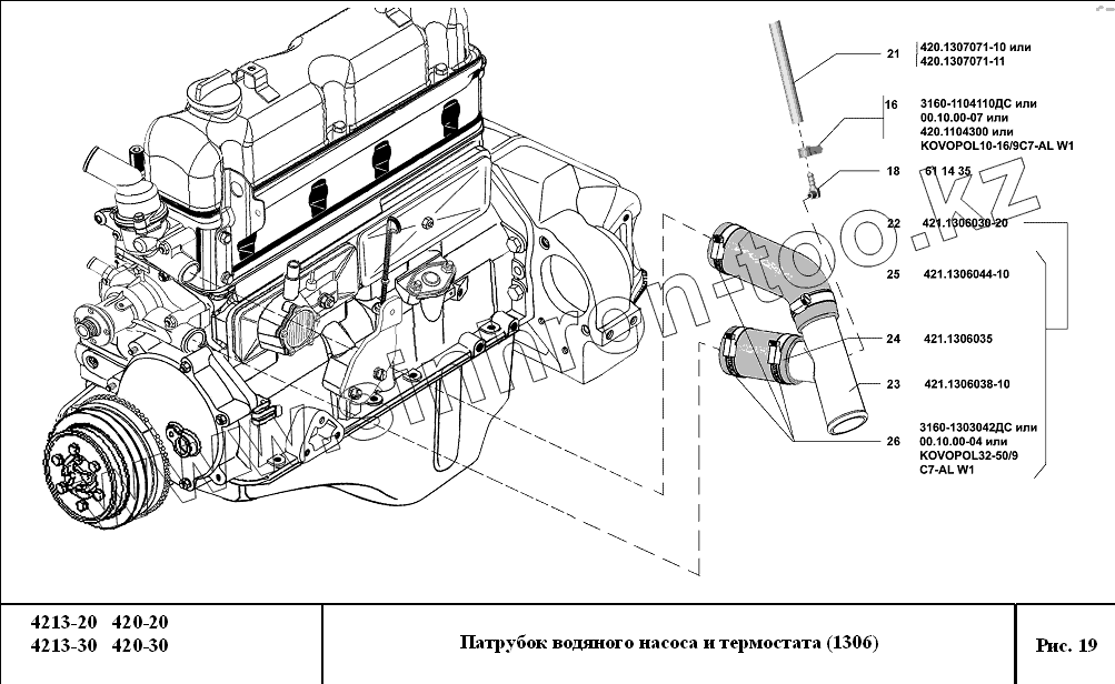 Каталог запасных частей к технике: УМЗ-4213, 420. Патрубок водяного насоса и термостата