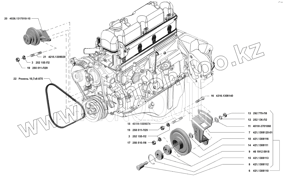 Каталог запасных частей к технике: УМЗ-4216 (Евро 3). Привод водяного насоса и вентилятора