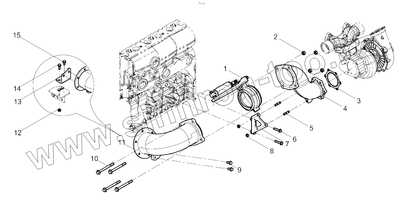 Каталог запасных частей к технике: Weichai WP13 DHP13Q0928. Rear Exhaust Manifold Group