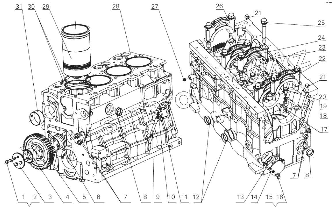 Каталог запасных частей к технике: Yuchai YC4D. D0200-1002000 Cylinder block assembly