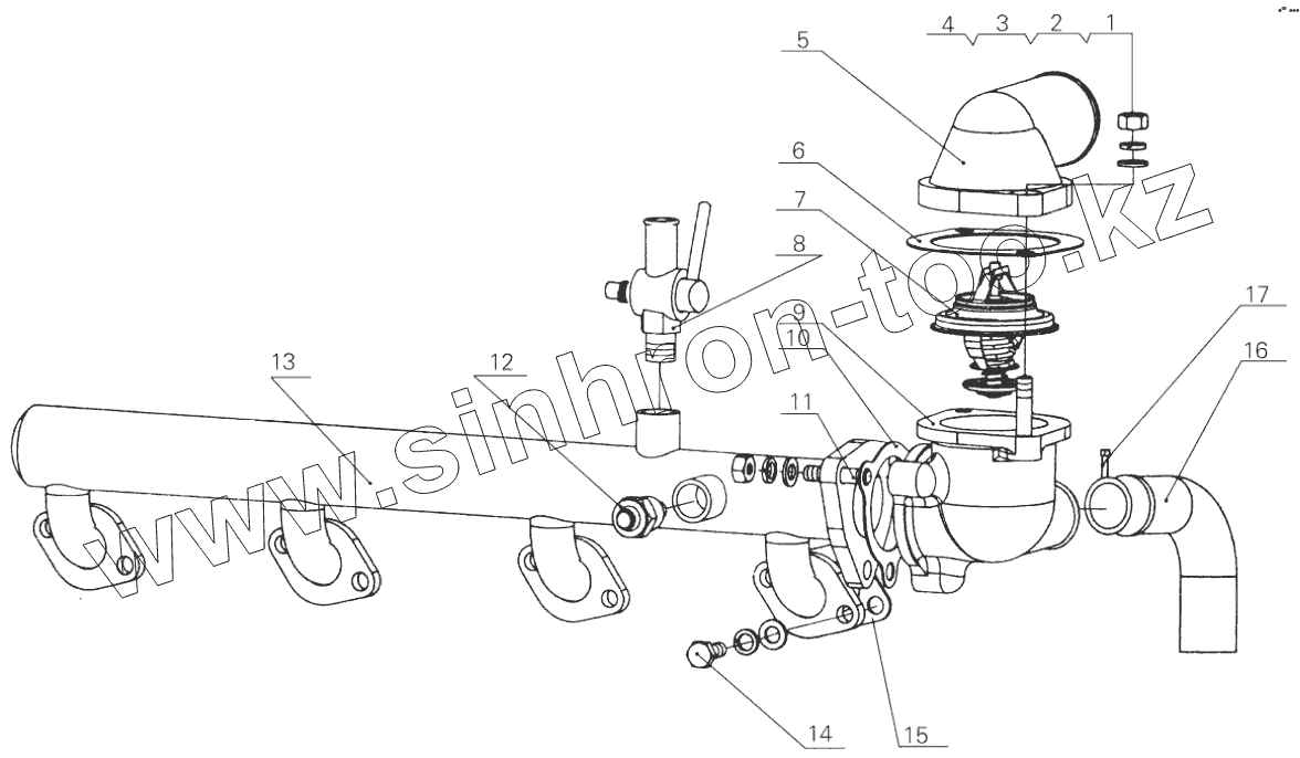 Каталог запасных частей к технике: Yuchai YC4D. D30-1303000 Water outlet pipe assembly