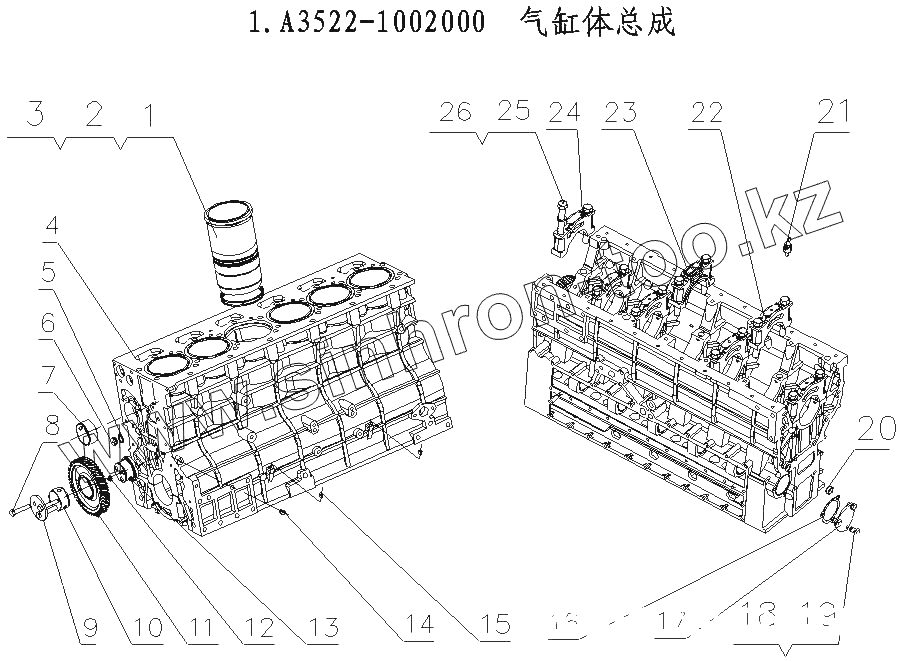 Каталог запасных частей к технике: Yuchai YC6A240-20 (A3515). A3522-1002000 Блок цилиндров в сборе
