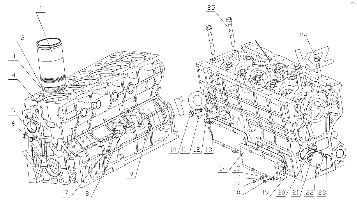 Каталог запасных частей к технике: Yuchai YC6B125-T11. B7615-1002000/07 Cylinder Block Assembly