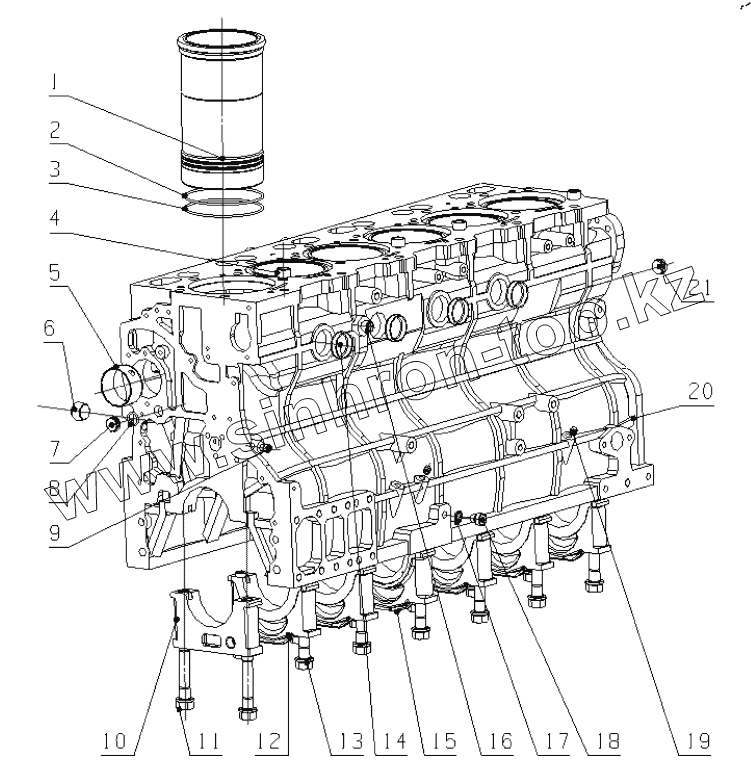 Каталог запасных частей к технике: Yuchai YC6J190-T301. Детали блока цилиндра JY100-1002100