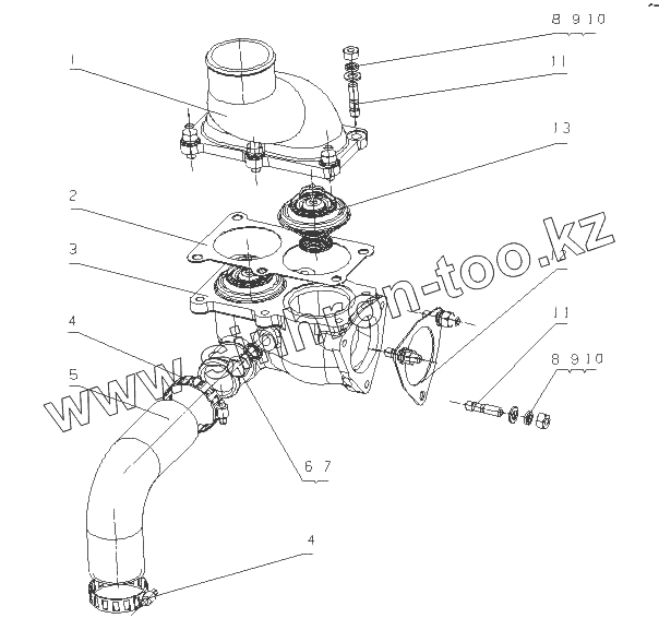 Каталог запасных частей к технике: Yuchai YC6M220G (M3020). M3001-1306000 Термостат в сборе