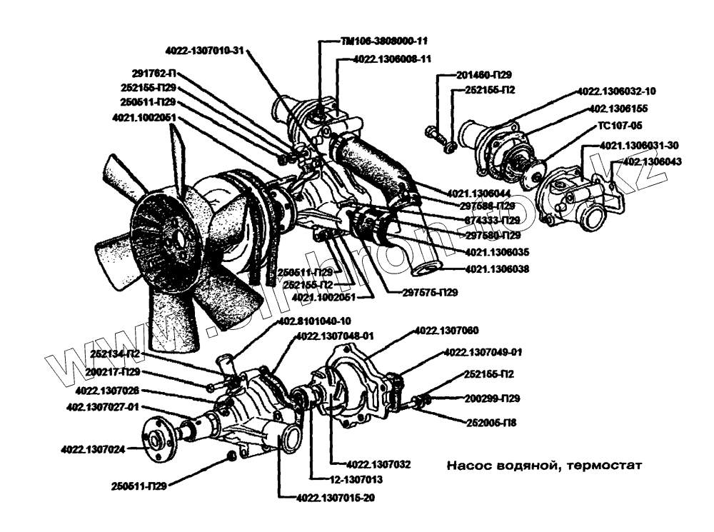 Каталог запасных частей к технике: ЗМЗ-402.10 (Евро 3). Насос водяной, термостат