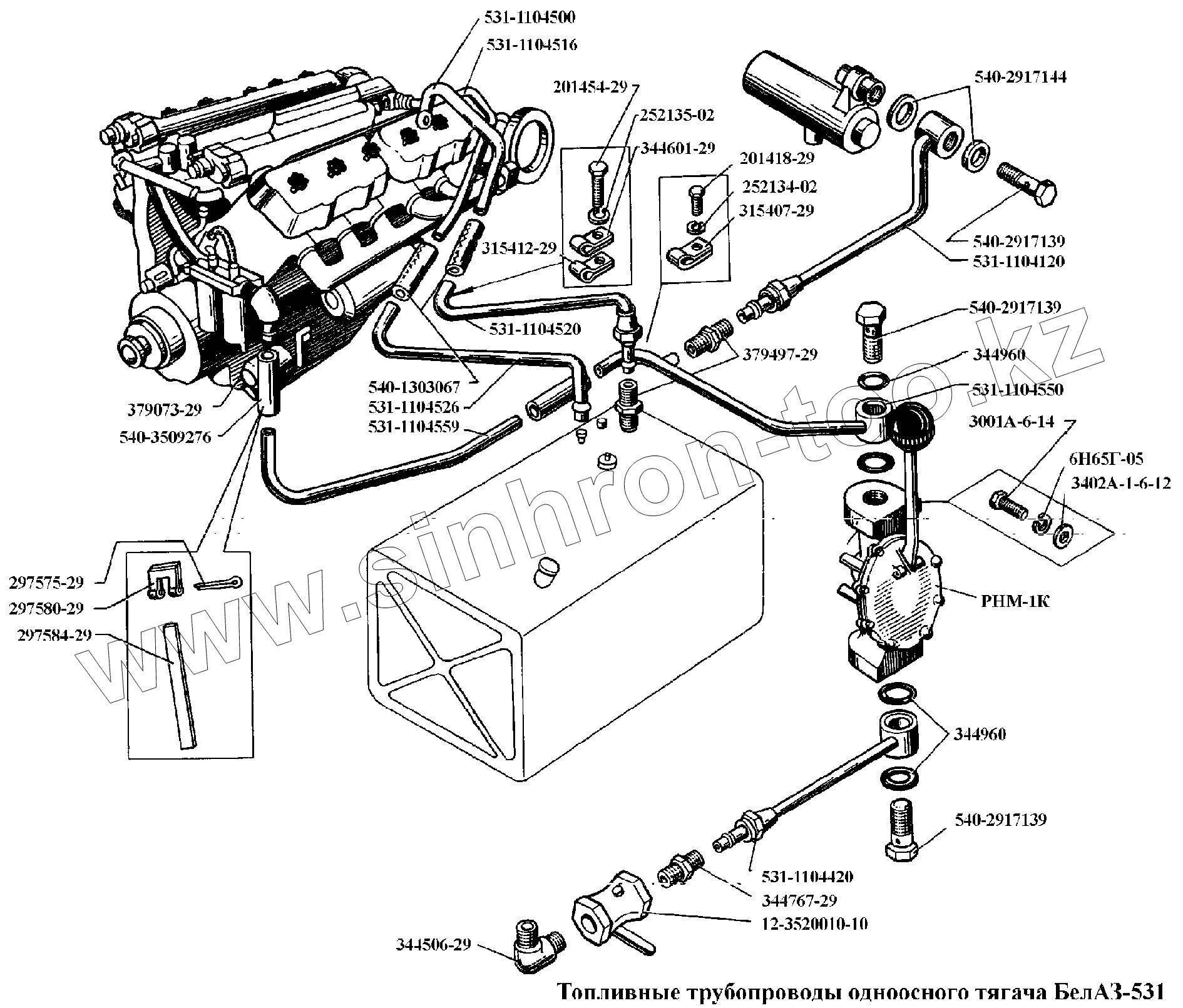 Каталог запасных частей к технике: БелАЗ-540А. Топливные трубопроводы одноосного тягача БелАЗ-531
