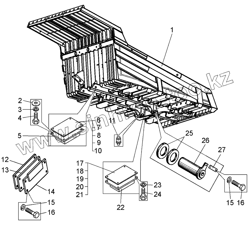 Установка платформы. Крепление цилиндра опрокидывающего механизма к платформе75600-8500001