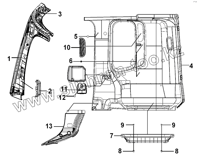 Каталог запасных частей к технике: DongFeng DFL-3251AW1. LH Side Wall Interior Trim Group