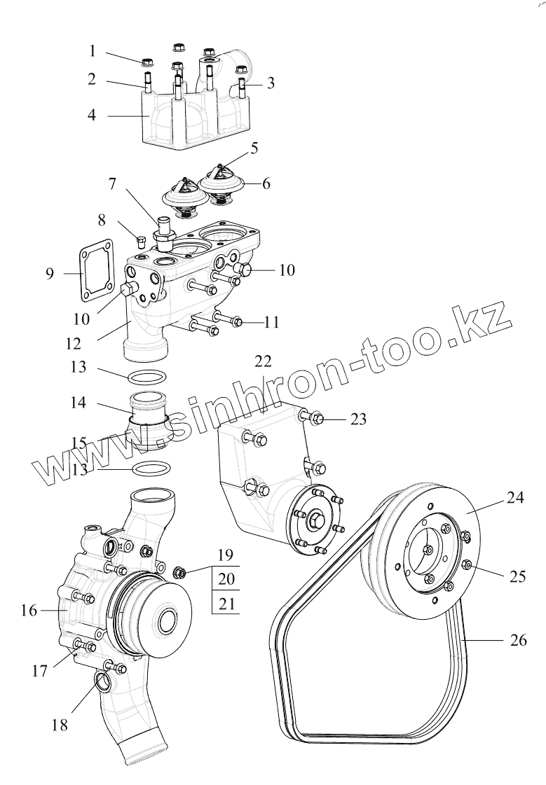 Каталог запасных частей к технике: FAW CA3251 (P66K2L2T1E5Z). Термостат, водяной насос, кронштейн вентилятора