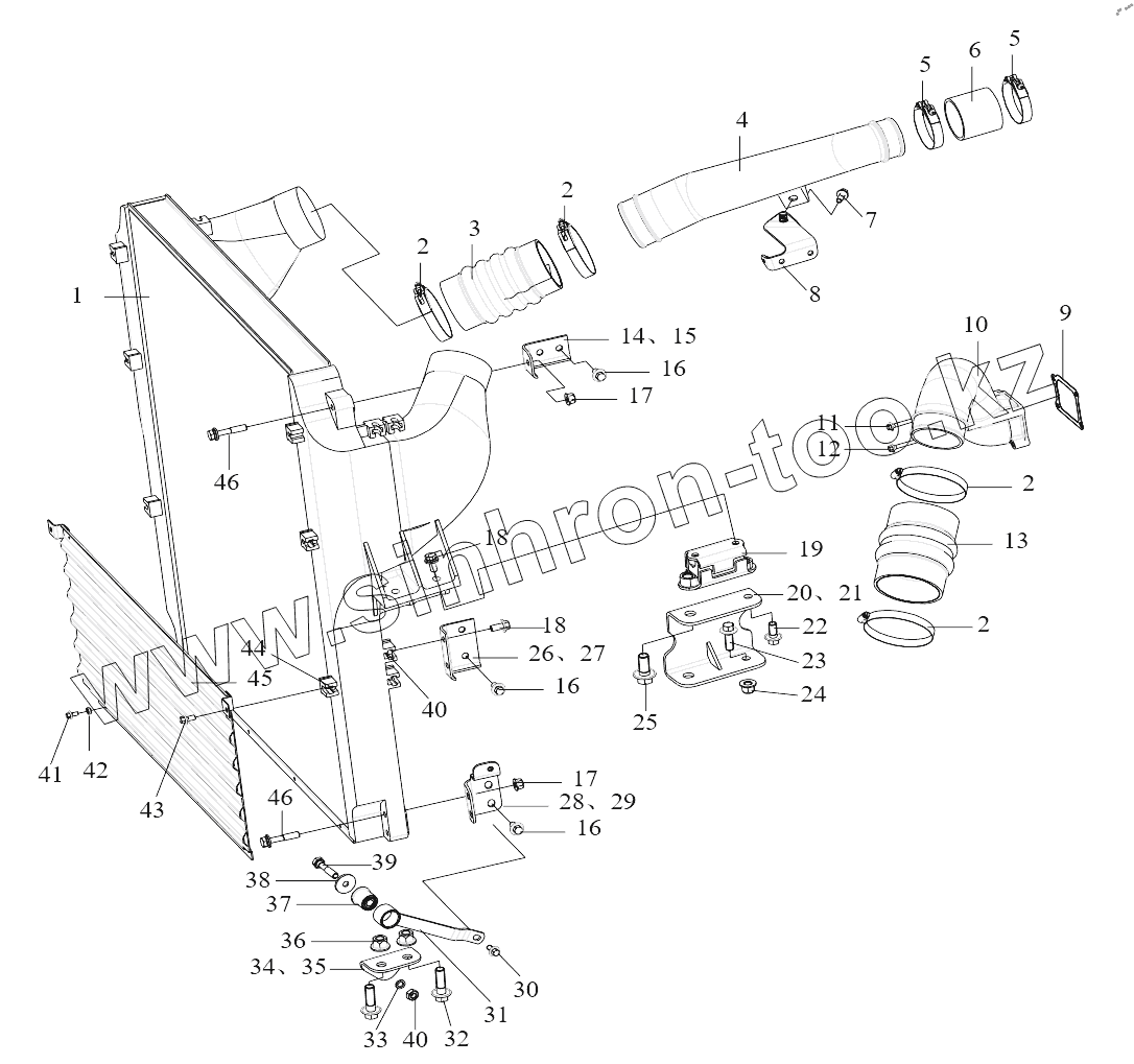 Каталог запасных частей к технике: FAW CA3310 (P66K24T4E5). Промежуточный охладитель, трубопроводы, подвеска, защитная сетка