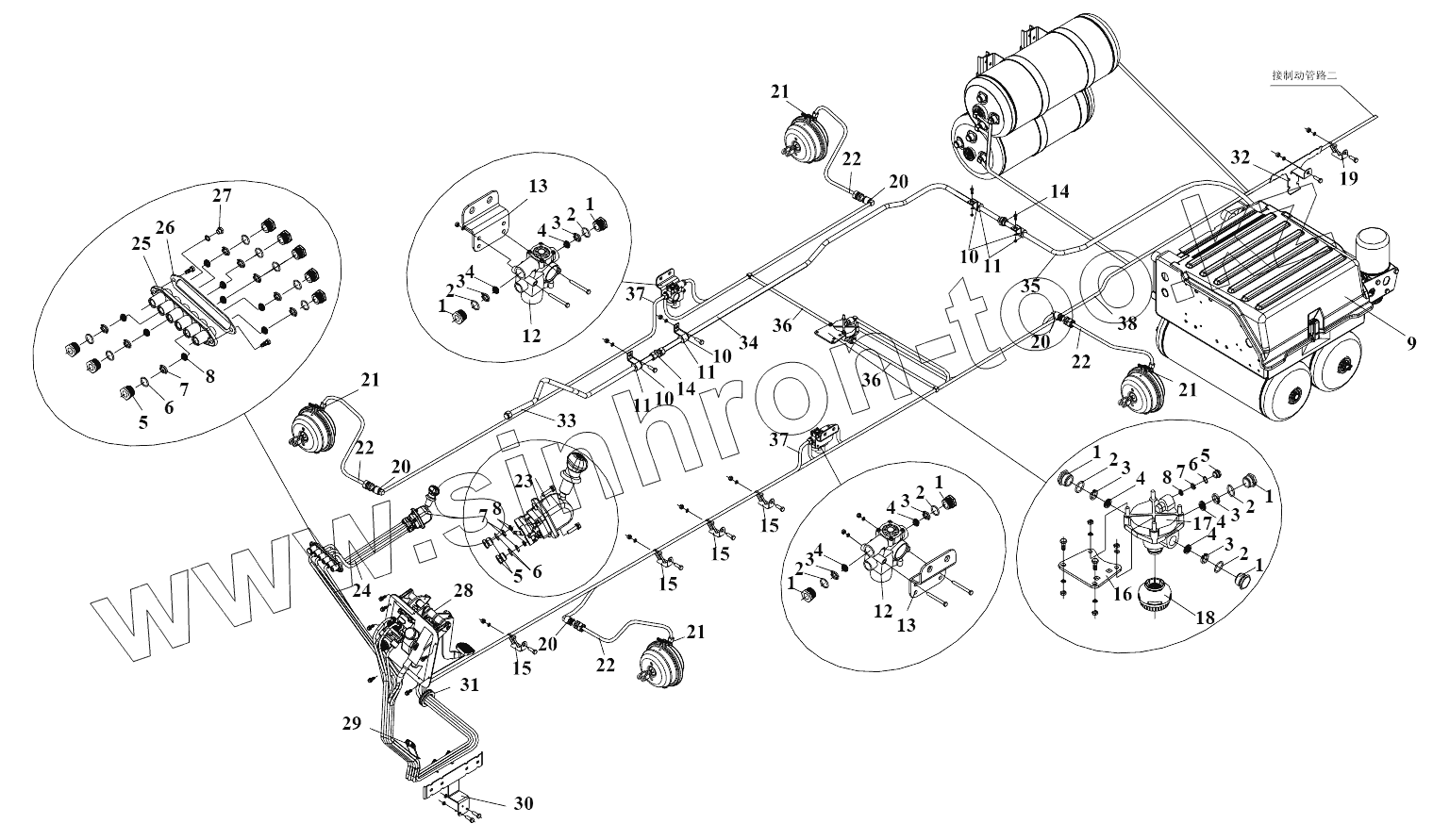 Каталог запасных частей к технике: FAW CA3310 (P66K24T4E5). Тормозные трубопроводы (I)