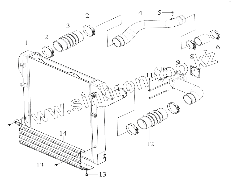 Каталог запасных частей к технике: FAW CA 3250 P66K2T1E5. Интеркулер, трубопроводы, подвеска, защитная сетка