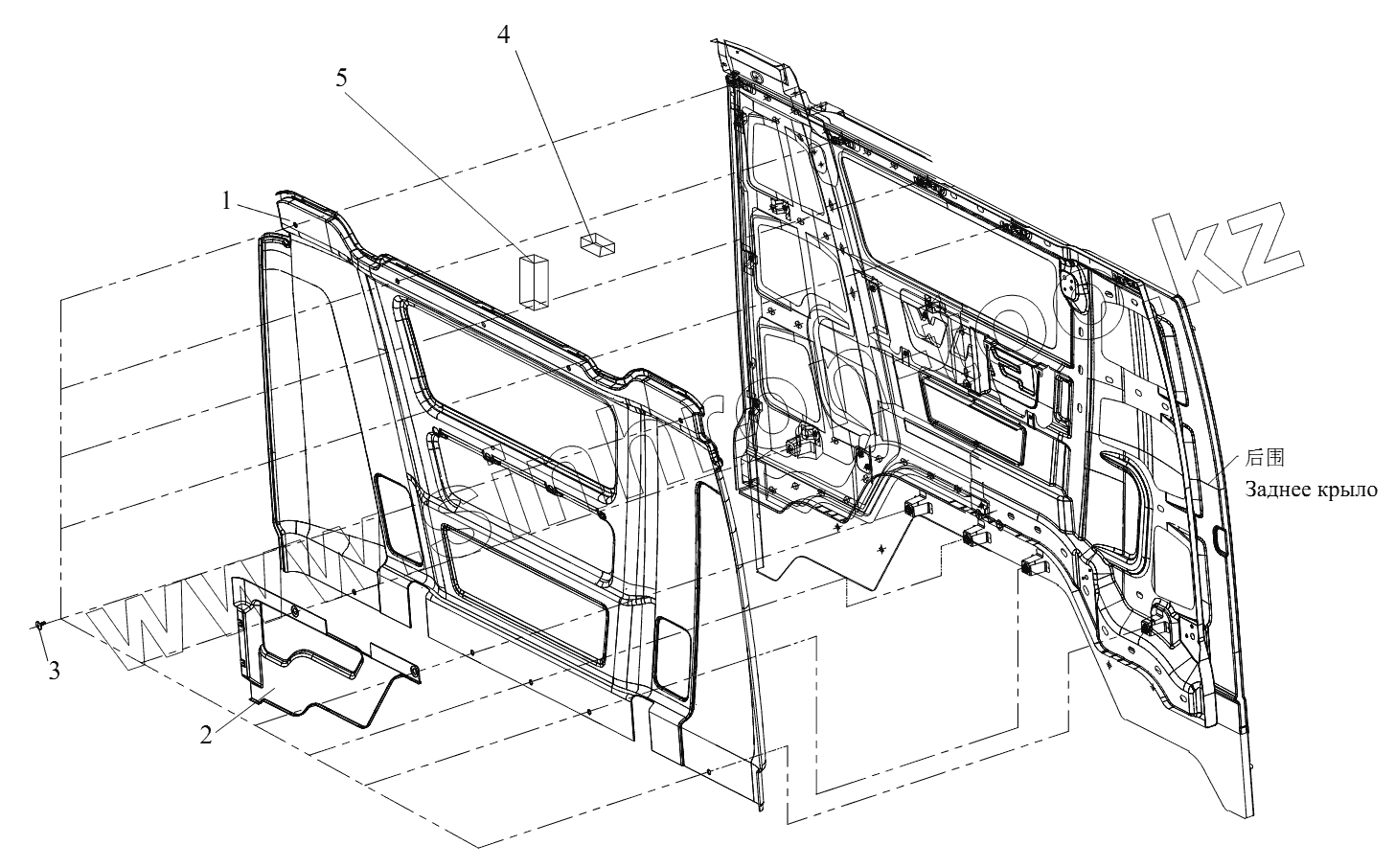 Каталог запасных частей к технике: FAW CA 3310 серии J6. Составляющие элементы обшивки панели задка
