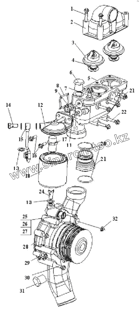 Каталог запасных частей к технике: FAW CA-3312 (P2K2B2T4A2Z). Термостат, водяной насос, стойка вентилятора