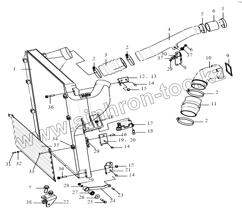 Каталог запасных частей к технике: FAW CA-4250 (P66K24T1E5). Интеркулер, трубопроводы, подвеска, защитная сетка