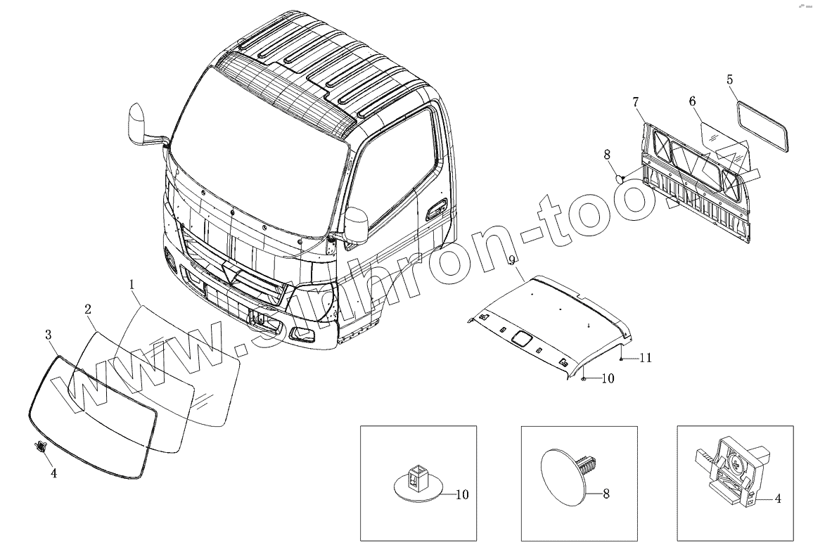 Каталог запасных частей к технике: Foton-BJ1039. Ветровое окно, задняя панель и аксессуары крыши
