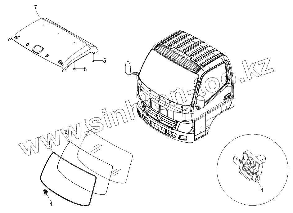 Каталог запасных частей к технике: Foton-BJ1069. Ветровое стекло и аксессуары крыши