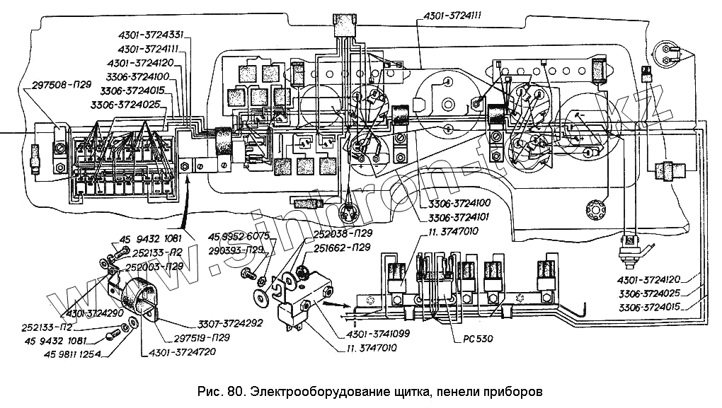 Каталог запасных частей к технике: ГАЗ-3306. Электрооборудование щитка, панели приборов