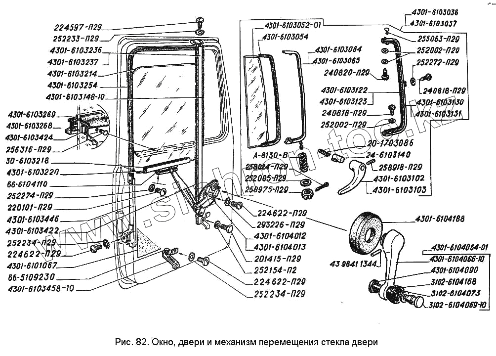 Каталог запасных частей к технике: ГАЗ-3306. Окно двери и механизм перемещения стекла двери