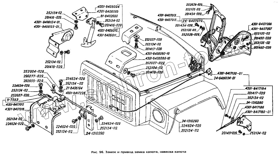 Каталог запасных частей к технике: ГАЗ-3306. Замок и привод замка капота, навеска капота