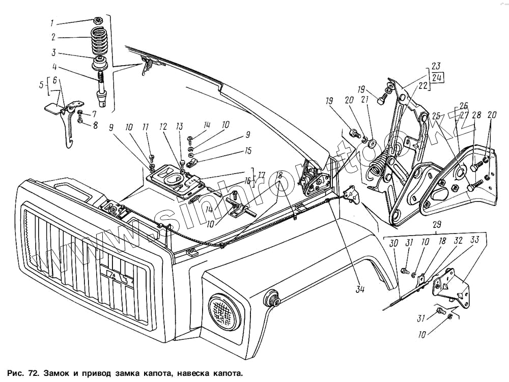 Каталог запасных частей к технике: ГАЗ-3307. Замок и привод замка капота, навеска капота