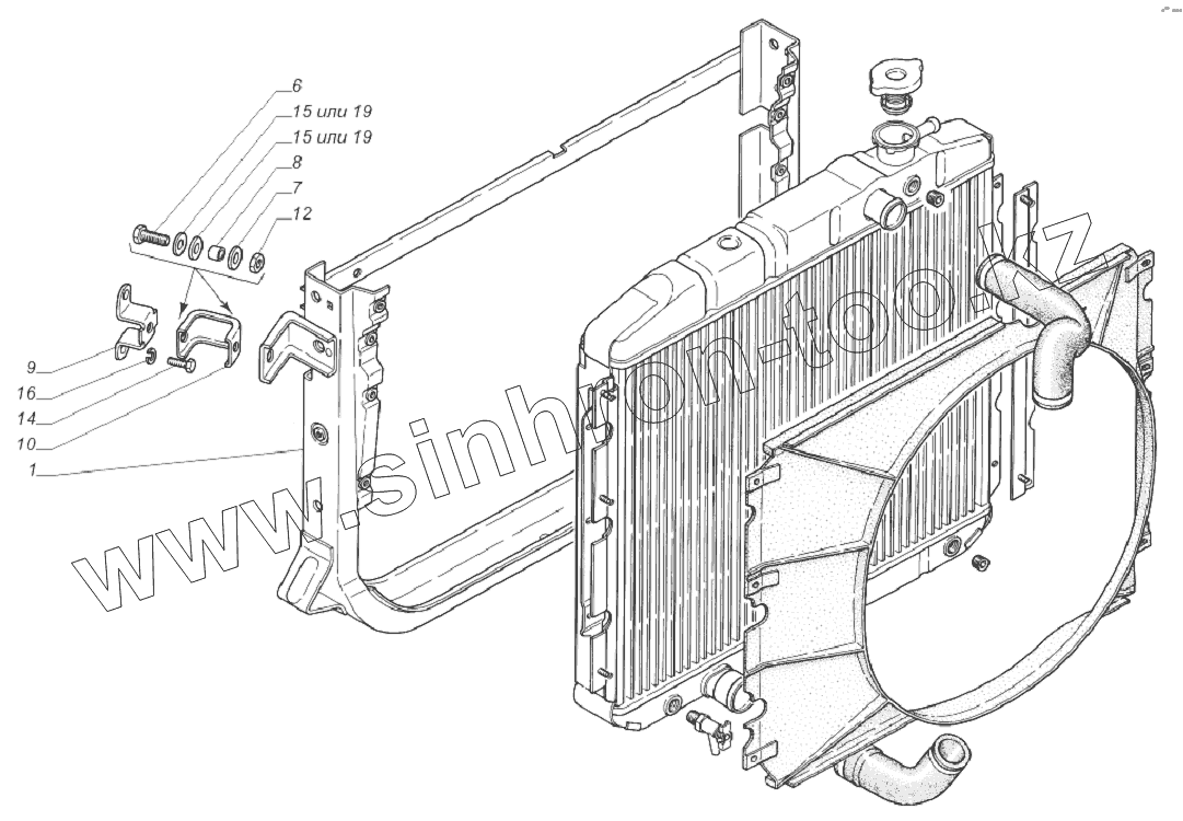 Каталог запасных частей к технике: ГАЗ-33081. 33081-1302003. Установка рамки с радиатором