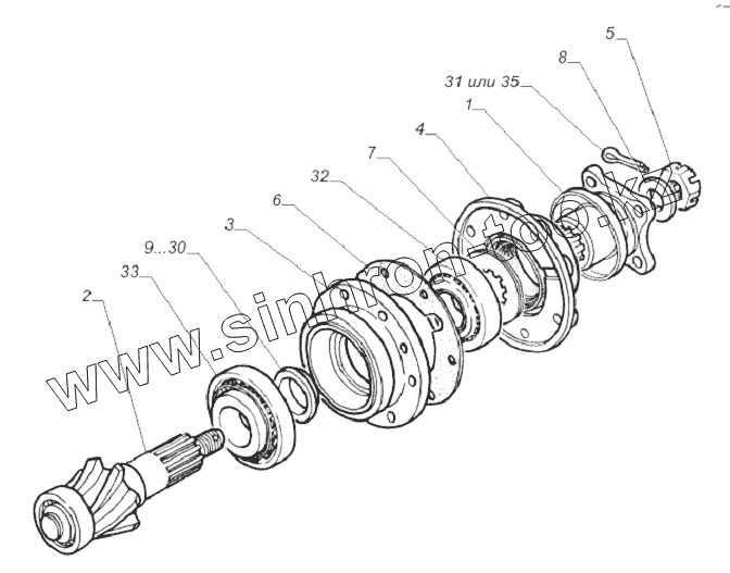 Каталог запасных частей к технике: ГАЗ-33081. 33081-2302014. Шестерня ведущая с подшипниками