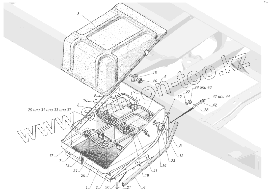 Каталог запасных частей к технике: ГАЗ-33081. 4301-3703001-10. Установка аккумуляторной батареи