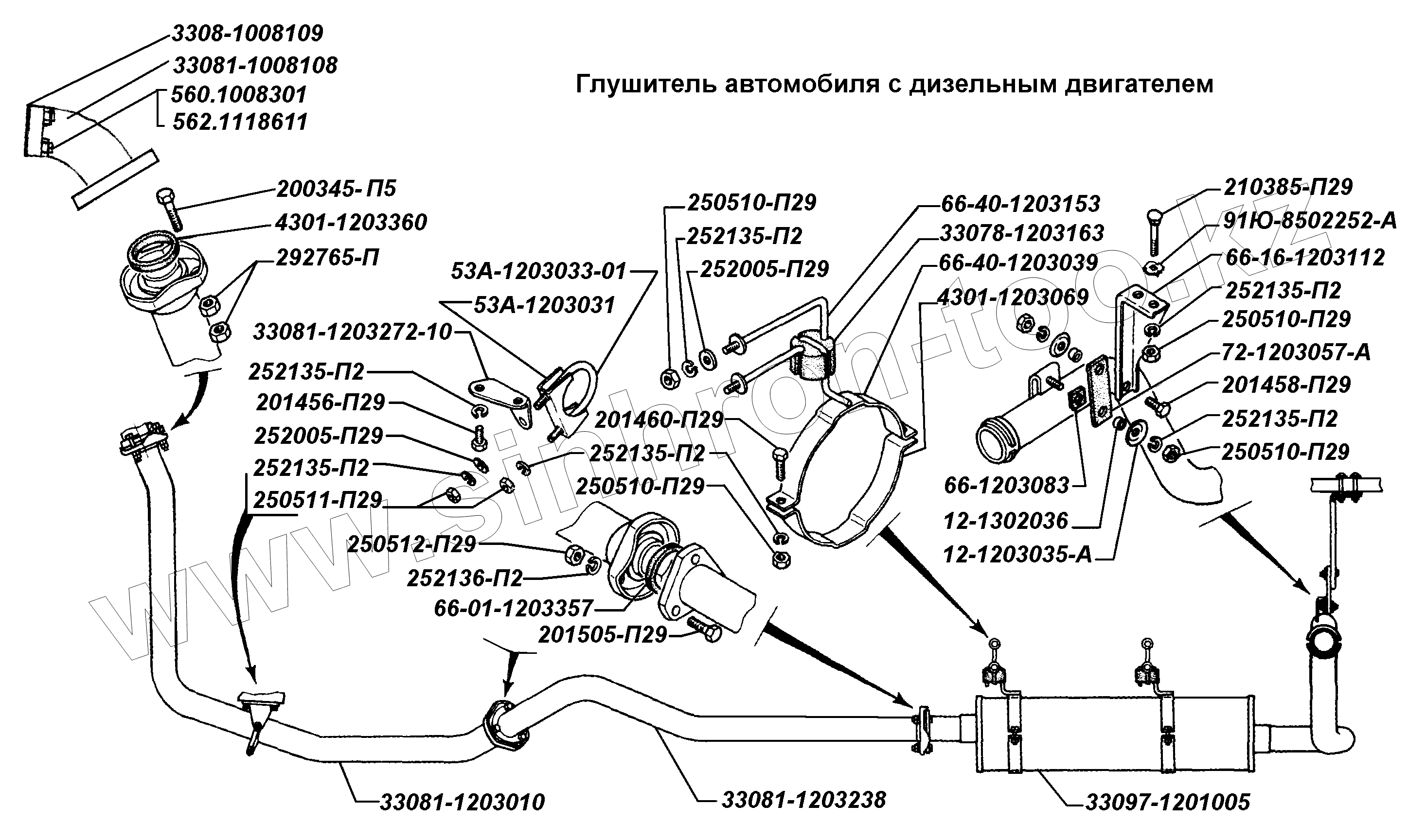 Каталог запасных частей к технике: ГАЗ-3308. Глушитель автомобиля с дизельным двигателем