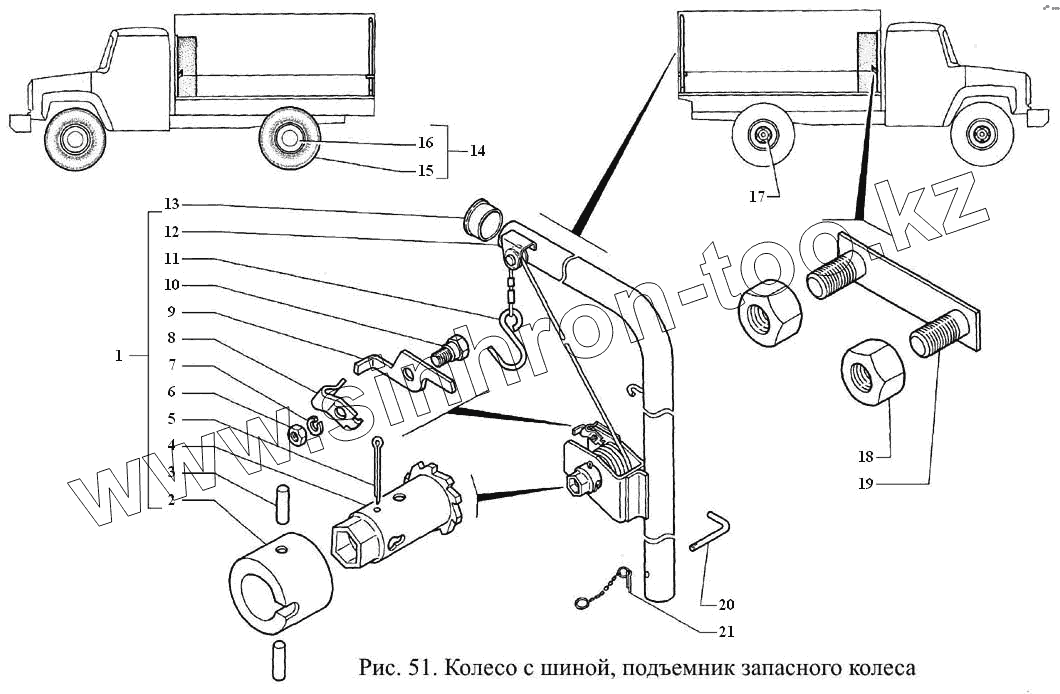 Каталог запасных частей к технике: ГАЗ-3308. Колесо с шиной, подъемник запасного колеса