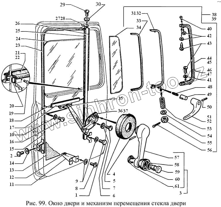 Каталог запасных частей к технике: ГАЗ-3308. Окно двери и механизм перемещения стекла двери