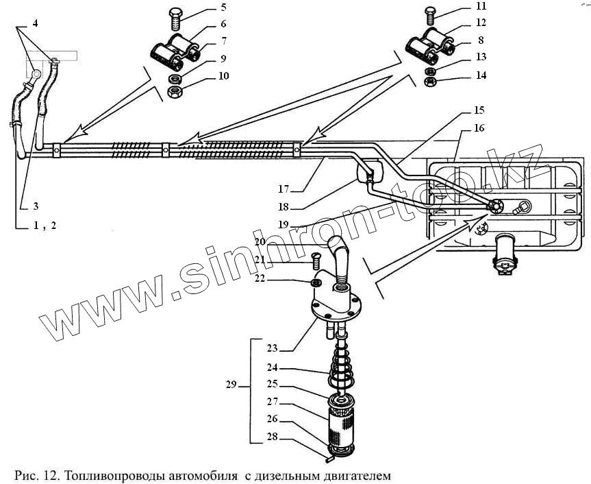 Каталог запасных частей к технике: ГАЗ-3308. Топливопроводы автомобиля с дизельным двигателем