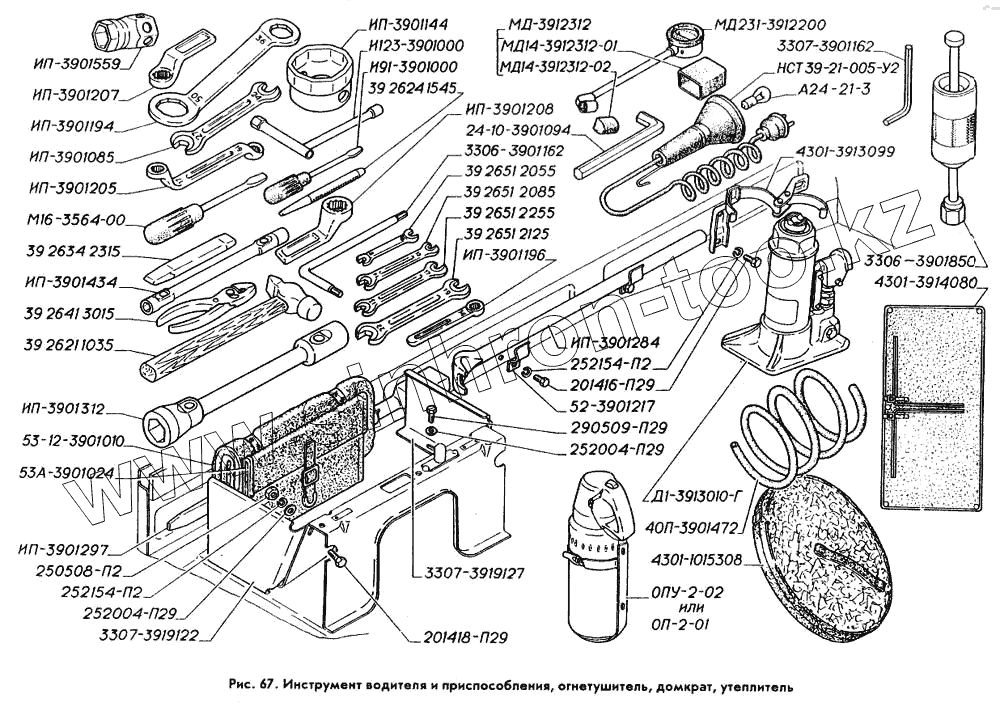 Каталог запасных частей к технике: ГАЗ-3309. Инструмент водителя и приспособления, огнетушитель, домкрат утеплитель