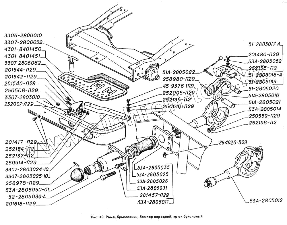 Каталог запасных частей к технике: ГАЗ-3309. Рама, брызговики, бампер передний, крюк буксирный