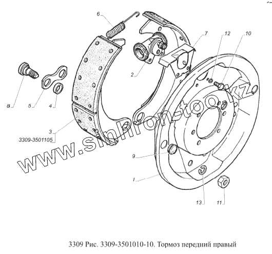 Каталог запасных частей к технике: ГАЗ-3309 (Евро 2). Тормоз передний правый