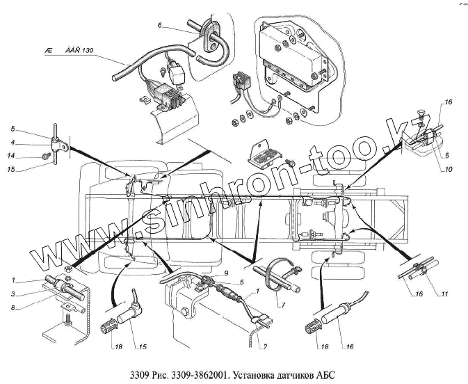 Каталог запасных частей к технике: ГАЗ-3309 (Евро 2). Установка датчиков АБС