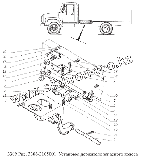 Каталог запасных частей к технике: ГАЗ-3309 (Евро 2). Установка держателя запасного колеса