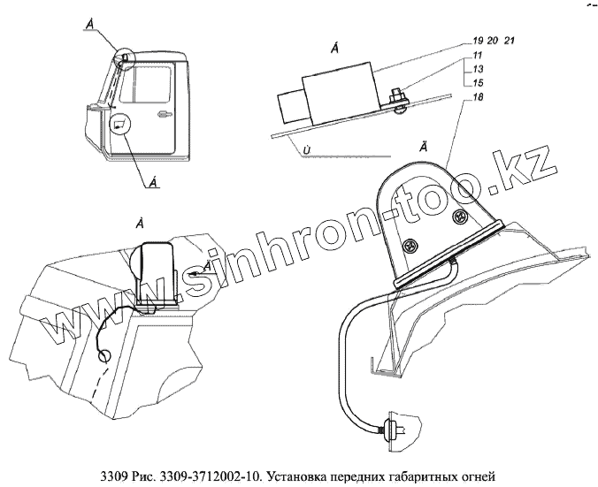 Каталог запасных частей к технике: ГАЗ-3309 (Евро 2). Установка передних габаритных фонарей