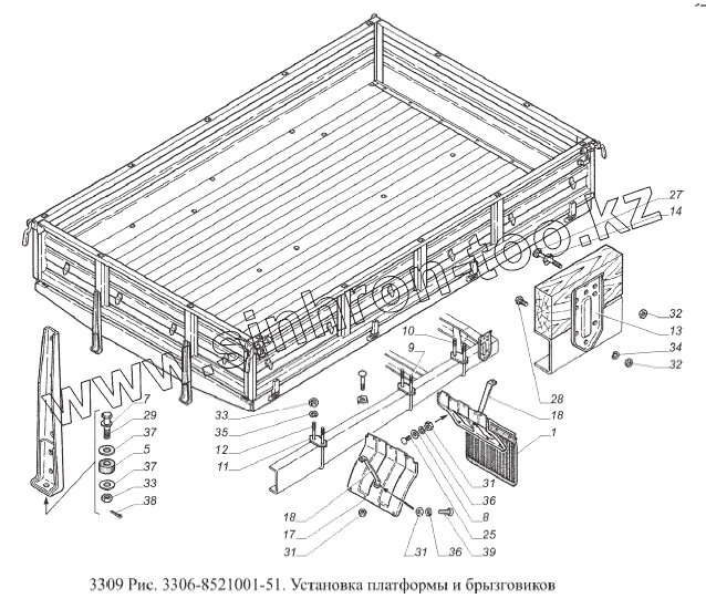Каталог запасных частей к технике: ГАЗ-3309 (Евро 2). Установка платформы и брызговиков