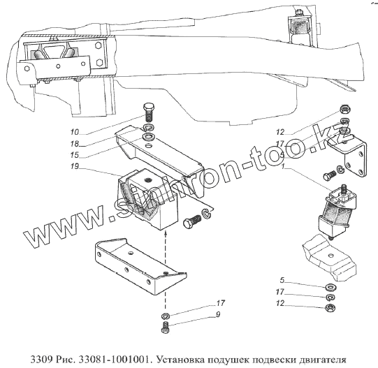 Каталог запасных частей к технике: ГАЗ-3309 (Евро 2). Установка подушек подвески двигателя