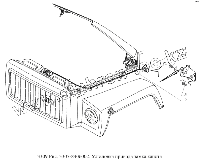 Каталог запасных частей к технике: ГАЗ-3309 (Евро 2). Установка привода замка капота