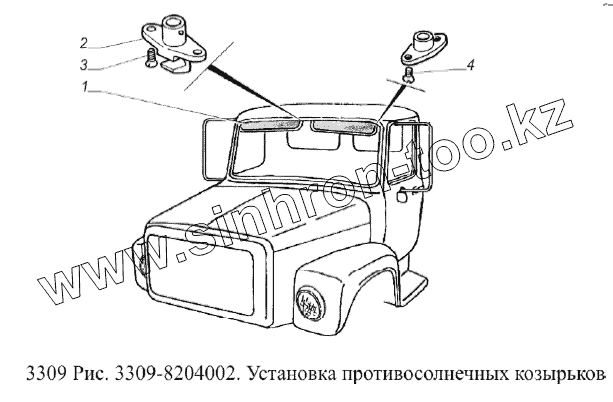 Каталог запасных частей к технике: ГАЗ-3309 (Евро 2). Установка противосолнечных козырьков