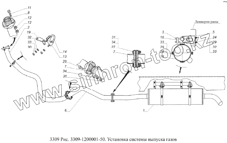 Каталог запасных частей к технике: ГАЗ-3309 (Евро 2). Установка системы выпуска газов