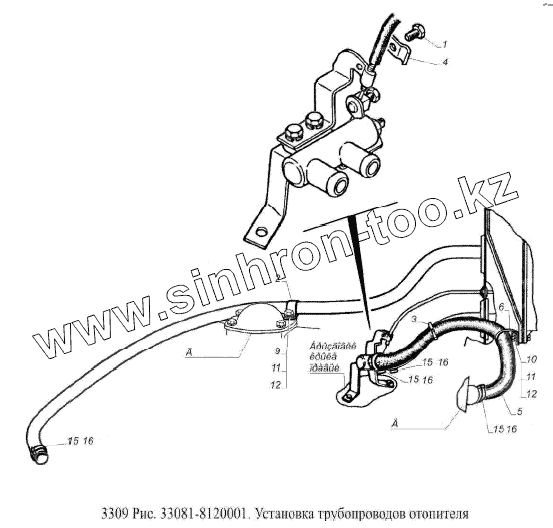 Каталог запасных частей к технике: ГАЗ-3309 (Евро 2). Установка трубопроводов отопителя