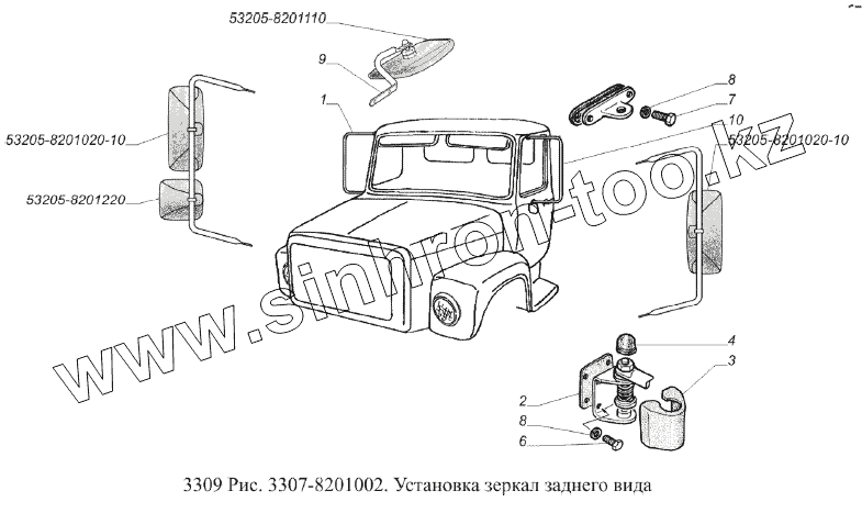 Каталог запасных частей к технике: ГАЗ-3309 (Евро 2). Установка зеркал заднего вида