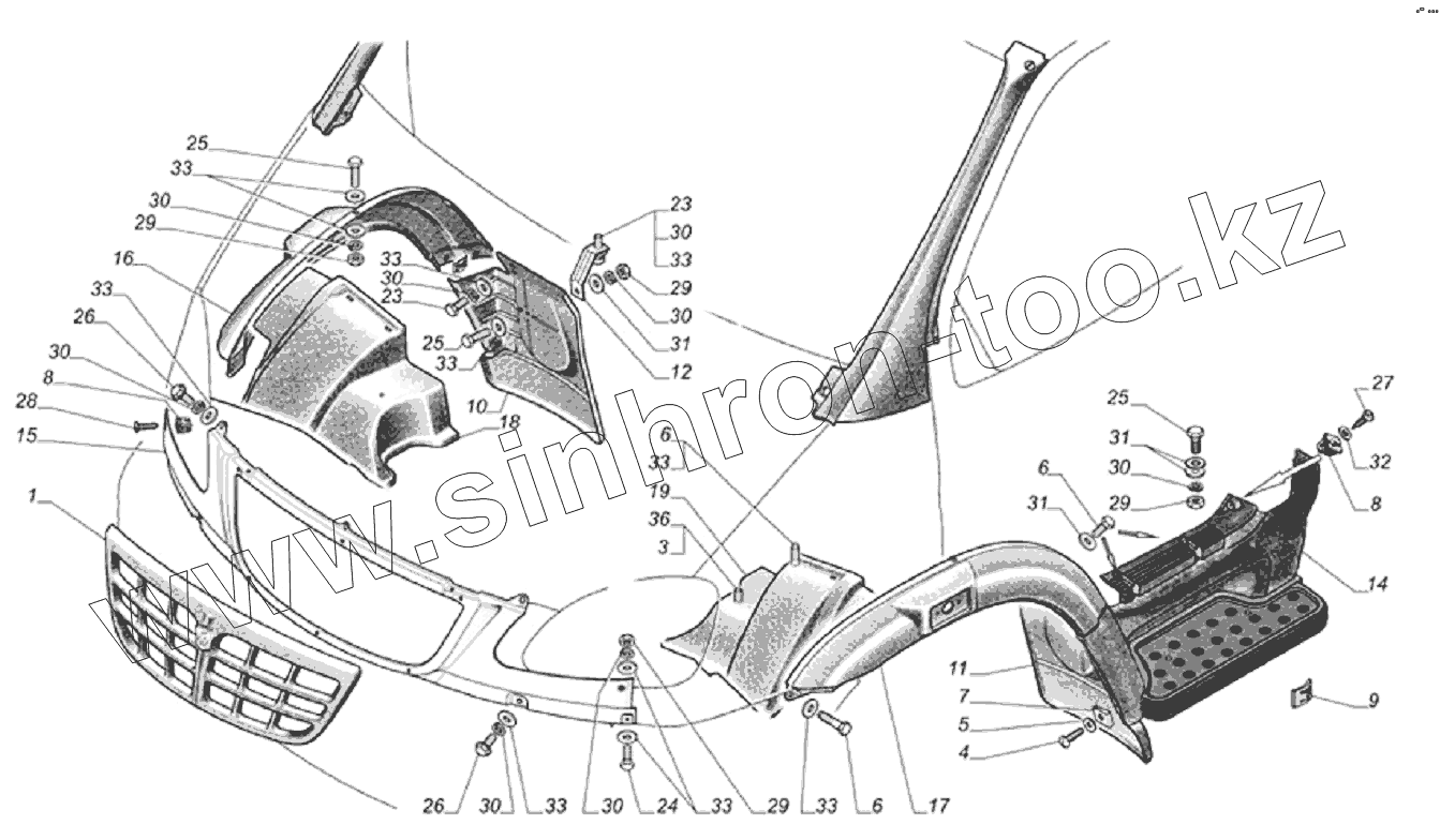 Каталог запасных частей к технике: ГАЗ-33106 Евро 3. Установка деталей оперения 33104-8400001