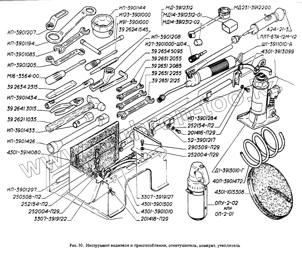 Каталог запасных частей к технике: ГАЗ-4301. Инструмент водителя и приспособления, огнетушитель, домкрат, утеплитель